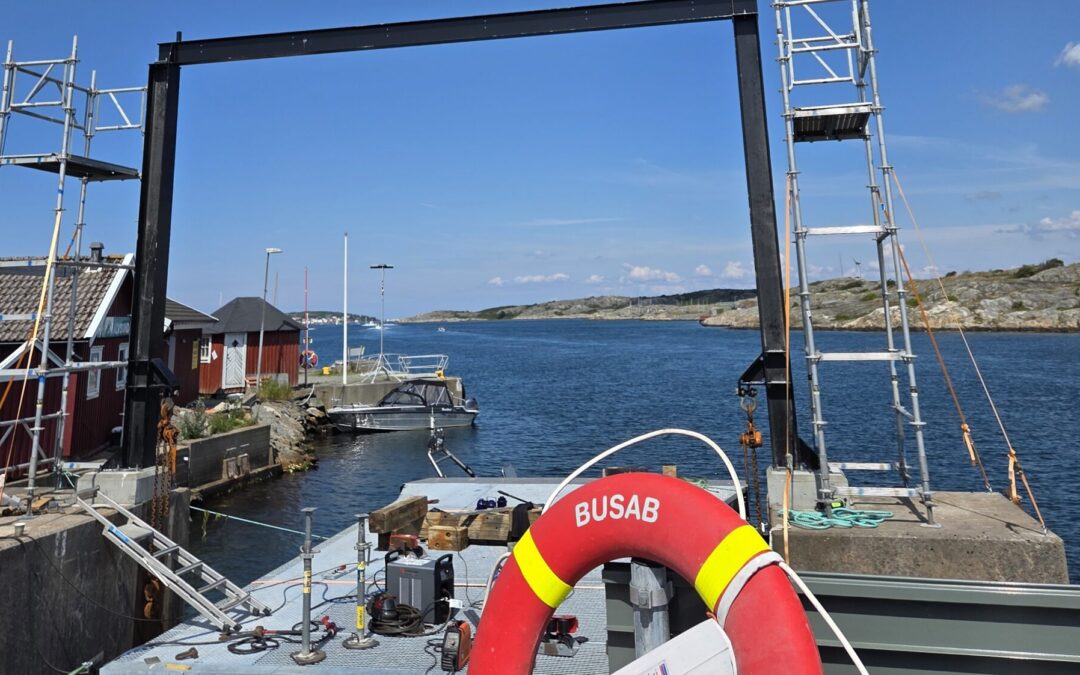 - Ytterligare en spännande tilldragelse var lanseringen av den nya klaffen till Kalvsunds Färjeläge, ett uppdrag som tyvärr inte kunnat utföras innan semesterperioden på grund av de starka vindar som rått, när vattennivån varierar med en dryg halvmeter från dag till dag, då blir det bekymmer. Hur som helst, när väl vinden mojnat och havet lagt sig så gick det till slut att få den på plats, alltid härligt att få arbeta i vår fantastiska skärgård, speciellt när solen skiner och i sällskap med glada medarbetare, fiskmåsar och leverantörer.